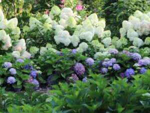 - Perennial borders that are mixed: Beds are anchored by hydrangeas, while the foreground is filled with lesser plants